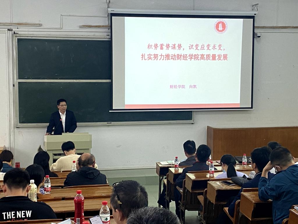财经学院院长向凯作了《积势蓄势谋势,识变应变求变,扎实努力推进财经学院高质量发展》的专题报告。他从师资队伍、人才培养、学科专业、科研学科等方面详细阐述了财经学院高质量发展的基本思路、创新路径及改革举措。他指出,未来一段时间,财经学院将以培养“精经济”“会管理”“通商法”“懂技术”的应用型、复合型、创新型、数智化的新财经人才为目标,主动对接“数字经济”“循环经济”“数智财经”等社会经济发展的重大需求,重塑数智化财经类人才培养新生态,构建“数智+财经”学科专业新体系,引培组建数智化师资新团队,创新建设数智化实践新场景,大力实施“学科科研筑基、专业融合提升、校企协同育人、卓越人才培养、培养模式创新”新工程,倾力打造“财经+大数据”“财经+人工智能”“财经+商法”新特色,强力培育科产教与学科专业新优势,全力助推学校高质量发展。